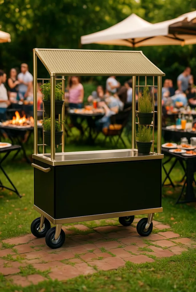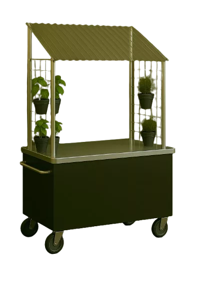 Als push cart, schnell transportiert und am Einsatzort aufgestellt. Steckbares Dach, Stromstecker f. Kochbetrieb von kleinen Küchengeräten und Beleuchtung, Farben nach RAL Vorgabe und Werbedruck möglich.