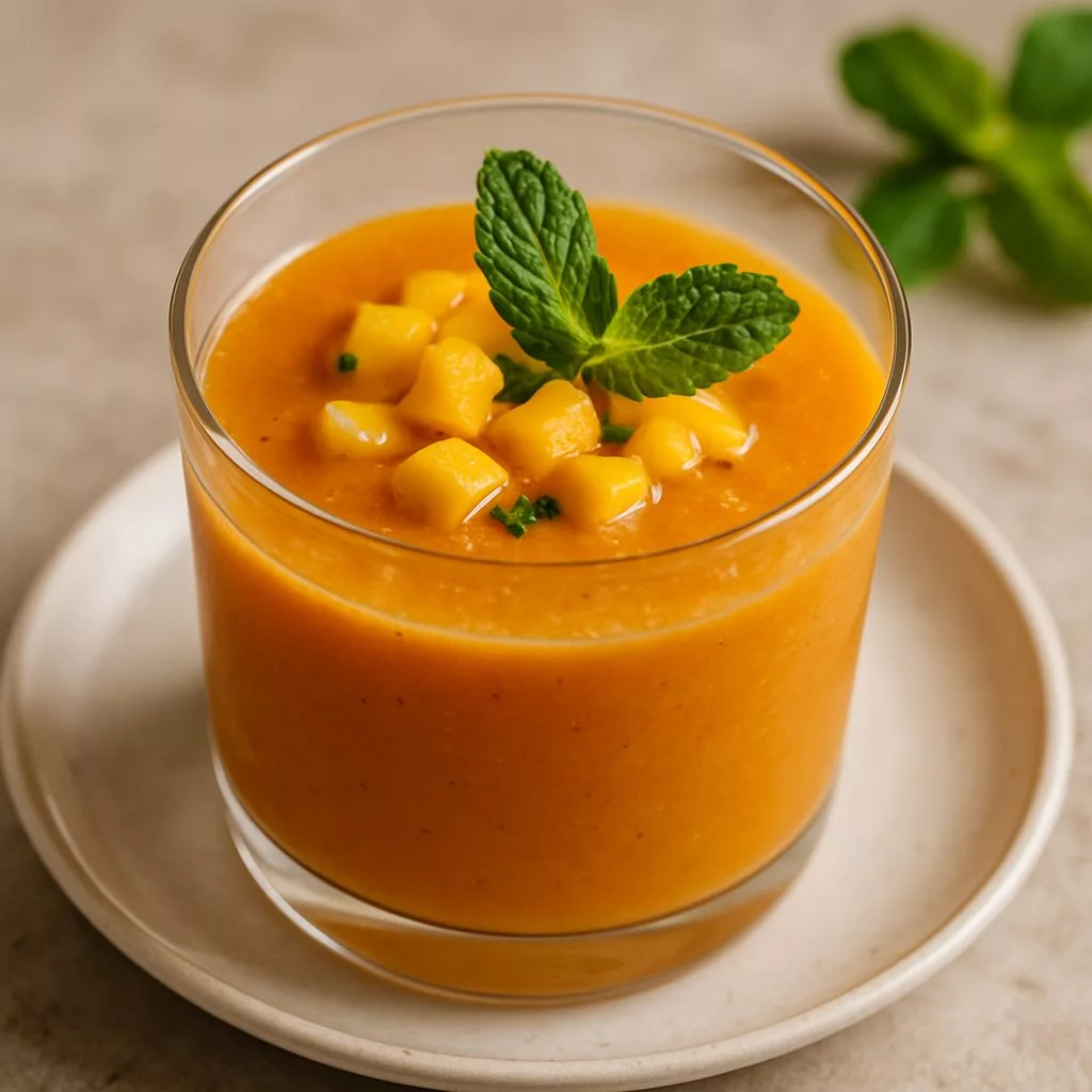 - Servieren: gut gekühlt in kleinen individuellen Gläsern servieren. Kurz vor dem Servieren könnt Ihr jedes Glas mit einigen frischen Minzblättern oder kleinen Mango- oder Gurkenwürfeln dekorieren.